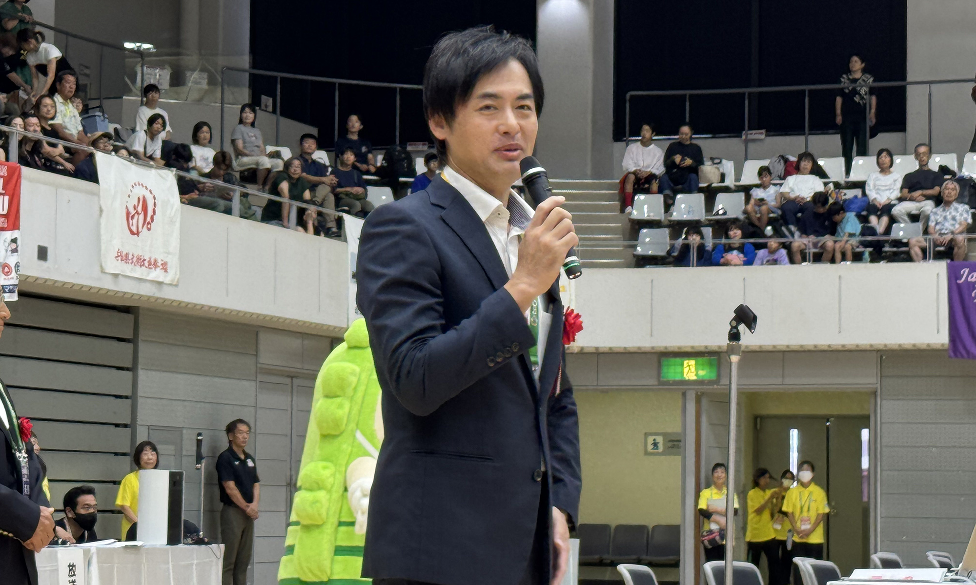 野洲市観光PRキャラクター「ドウタクくん」も登場! 売店コーナーには武術グッズのほか、キッチンカーの出店なども