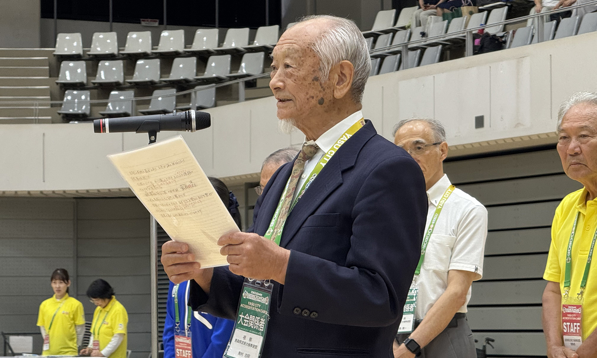 41都道府県の監督・代表選手が入場し、川端達夫滋賀県連盟会長が開会を宣言しました。国歌斉唱の後、財務大臣、衆議院議員・加藤勝信日本連盟会長のご挨拶を川﨑雅雄副会長が代読され、続いて櫻本直樹野洲市長から歓迎のことばをいただきました。続いて、岩佐育代総審判長による競技ルールの説明がなされました。最後に、開催地である滋賀県代表の髙橋琉晟選手、本間春香選手が出場選手を代表して選手宣誓を行うと盛大な拍手がおくられ、会場の空気が一気に引き締まりました。