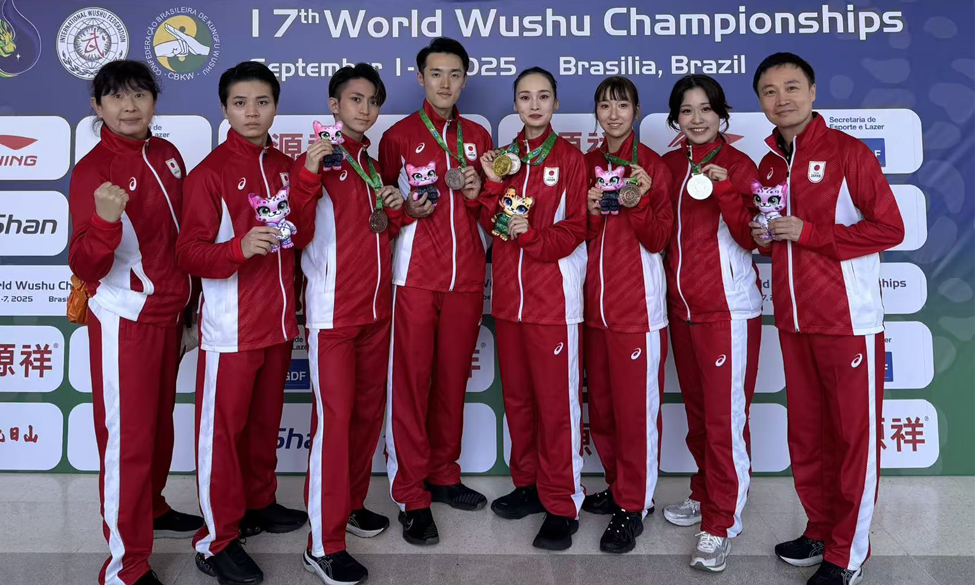 日本代表選手団(TEAMJAPAN)は、套路競技は男女計6人の選手と監督・コーチ2人、審判員1人、散打競技はコーチ1人、選手1人の体制で参加し、金1個、銀1個、銅4個、計6個のメダルを獲得。全套路選手が入賞という輝かしい成果を収めました。