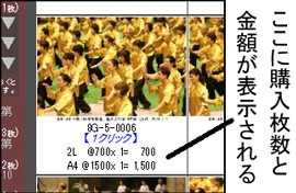 キ)図5の右側で,並んだ写真をクリックすると,より大きな写真のウインドウが表示される。このウインドウ内で写真を確認した上で,希望サイズの枚数を入力して「注文する」をクリックする(購入しない場合は,そのまま「閉じる」をクリック)。
