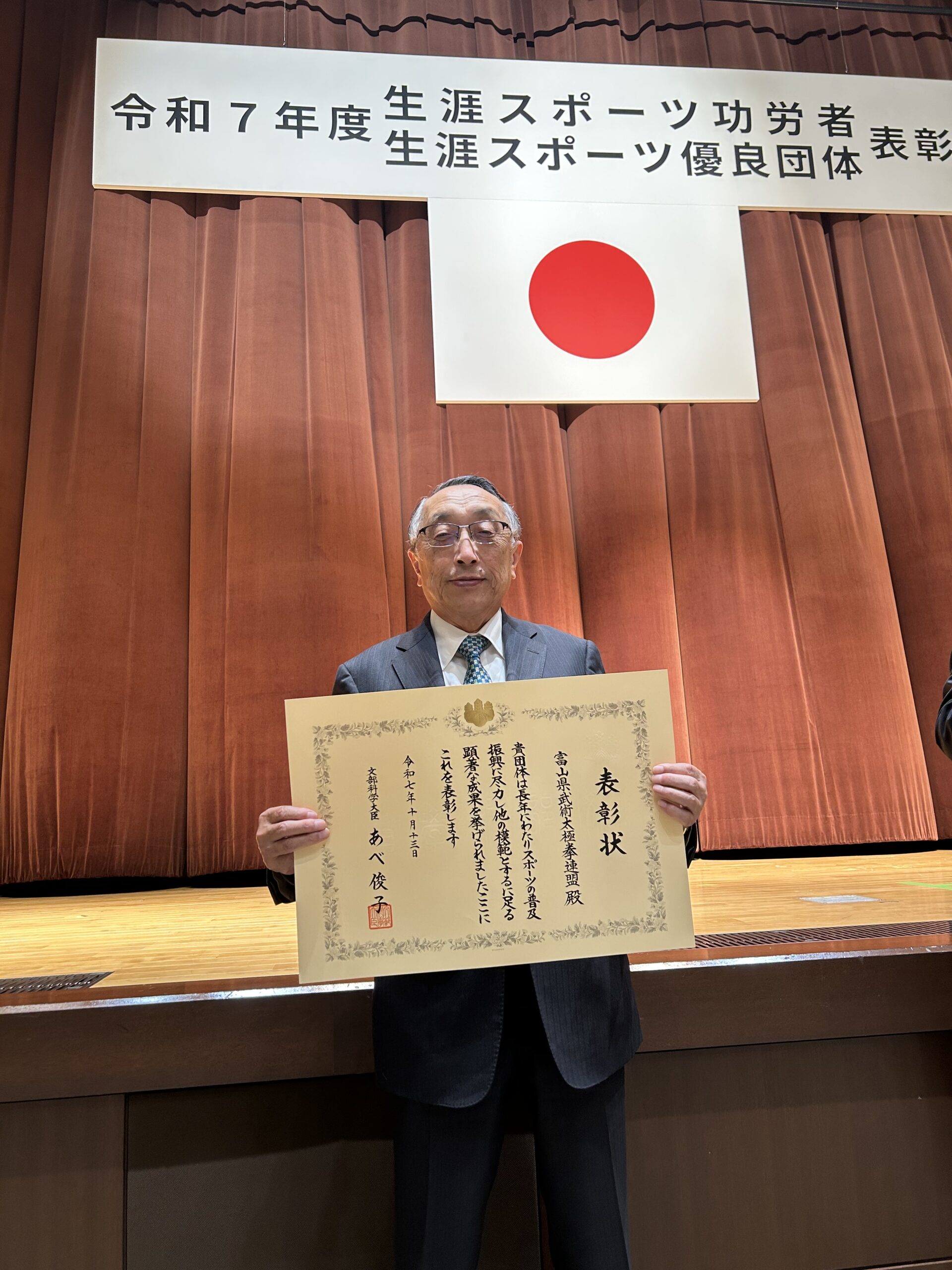 富山県武術太極拳連盟は、このたび長年にわたる武術太極拳の普及振興と顕著な功績が認められ、文部科学大臣「生涯スポーツ優良団体表彰」を受賞しました。