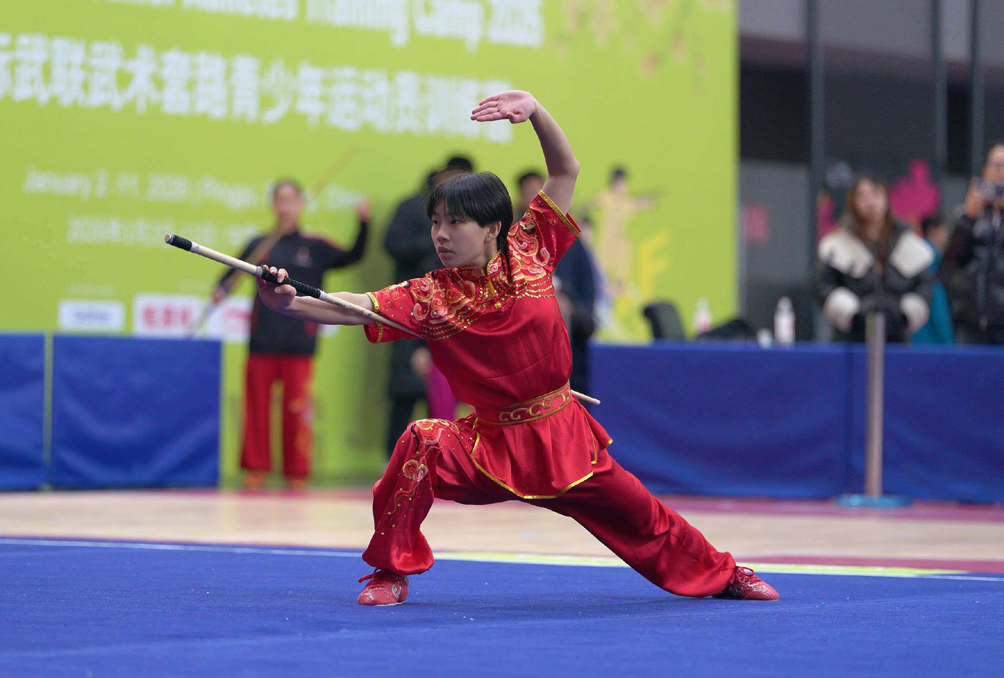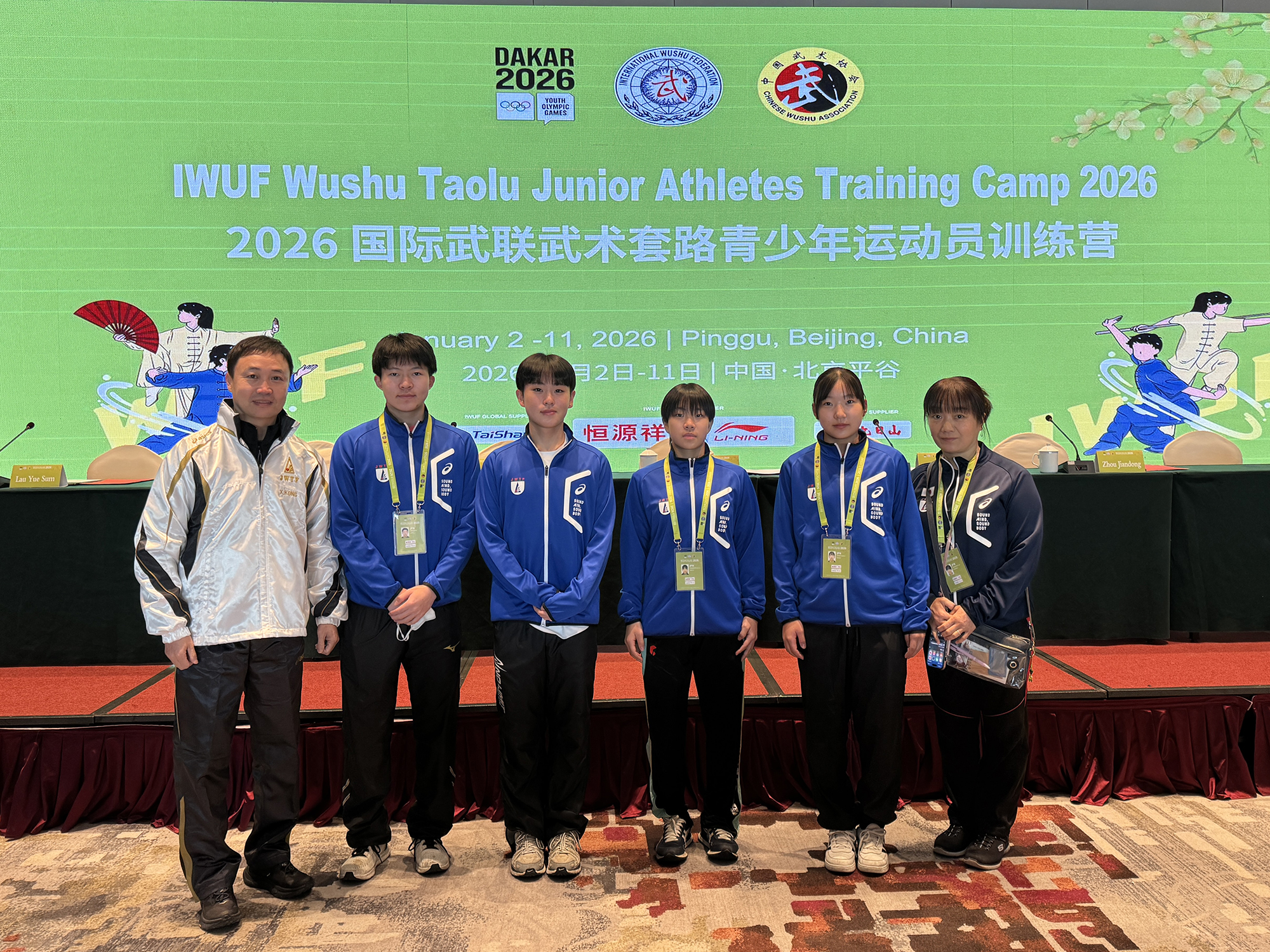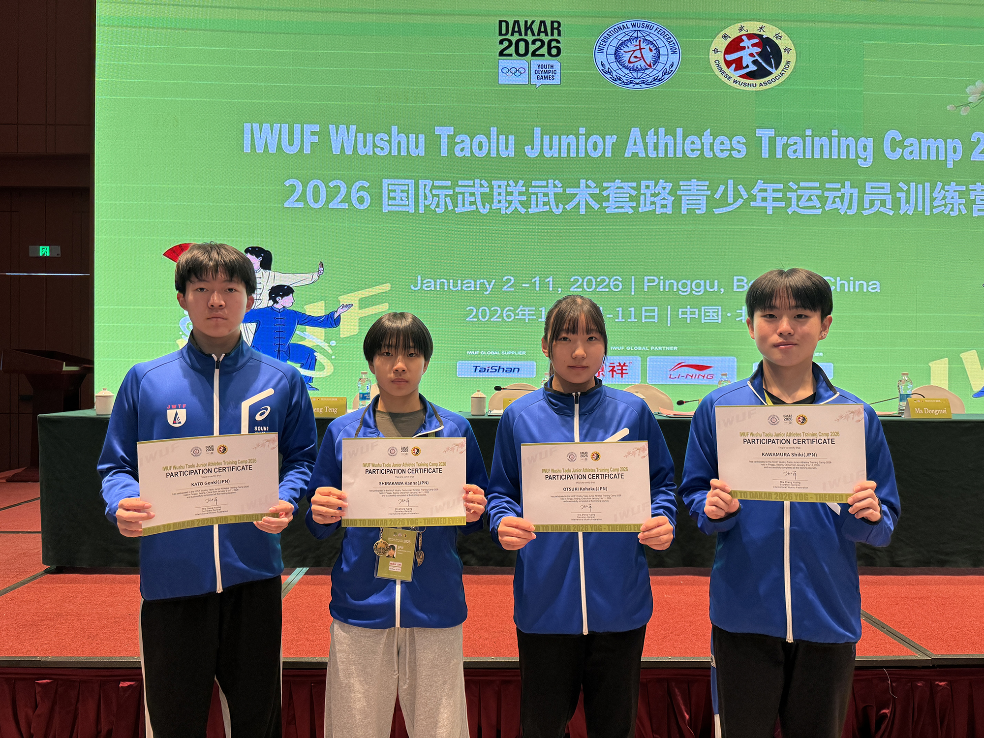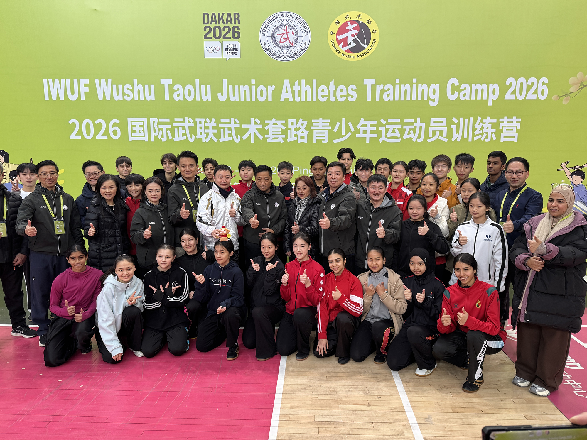 今年10月にセネガル・ダカールで開催される第4回ユースオリンピック競技大会では、武術太極拳が正式種目として採用されます。この歴史的な大会に向けた準備の一環として、「国際武術連盟(IWUF)武術套路ジュニアアスリートトレーニングキャンプ」が、2026年1月2日から11日までの10日間、中国・北京市平谷体育中心で実施されました。>このキャンプは、ユースオリンピックの年齢基準に合致するジュニア選手を対象としており、日本からは今年3月に開催される世界ジュニア大会の代表選手の中から4名が参加しました。1月3日には開営式が行われ、国際武術連盟(IWUF)の張玉萍事務局長をはじめとする要人が出席しました。世界22の国と地域から総勢122名のジュニア選手および指導者が集まり、武術が世界規模で広がりを見せていることを実感できる式典となりました。講師陣には、王二平氏、呉雅楠氏(太極拳)、趙慶建氏、劉清華氏(長拳)といった世界チャンピオン経験者を含む中国トップレベルの指導者が招かれ、参加選手にとって非常に貴重な直接指導の機会となりました。